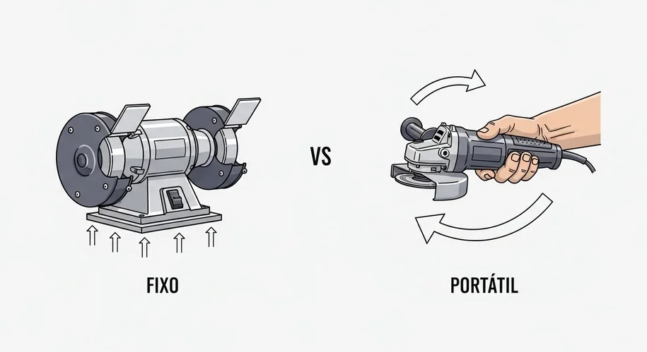 O motoesmeril é uma ferramenta de bancada usada para afiação e acabamento com alta precisão. Já a esmerilhadeira é portátil e indicada para cortes, desbastes e trabalhos mais pesados em diversos materiais.