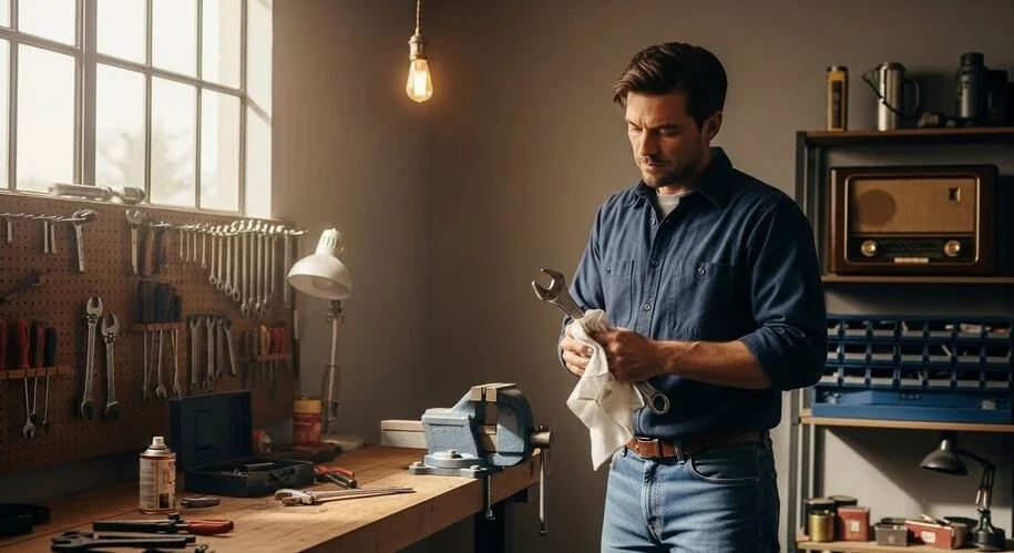 Limpeza Imediata: Nunca guarde uma ferramenta suja. Use pano seco ou escova para remover poeira, serragem, graxa e resíduos. Para sujeira pesada, um bom desengraxante resolve. Seque totalmente antes de guardar.
