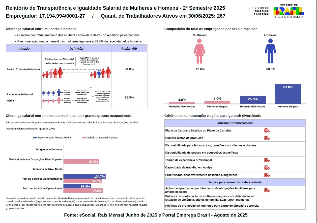 Conforme determinação estabelecida pela Portaria MTE nº 3.714, de 2023, bem como o Decreto Federal nº 11.795, de 2023, os quais regulamentaram as obrigações instituídas pela Lei 14.611, de 2023 – Lei de Igualdade Salarial, todas as empresas com mais de 100 empregados devem publicar semestralmente o relatório disponibilizado pelo Ministério do Trabalho e Emprego (MTE), contendo as médias e medianas das remunerações anuais baseadas nos dados do e-Social de 2023 tomando por base a utilização do CBO (Código Brasileiro de Ocupações).