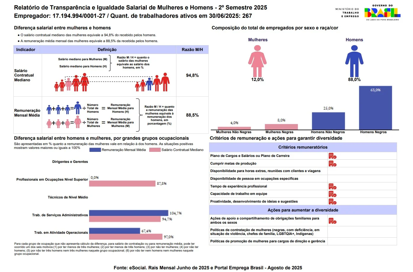 Conforme determinação estabelecida pela Portaria MTE nº 3.714, de 2023, bem como o Decreto Federal nº 11.795, de 2023, os quais regulamentaram as obrigações instituídas pela Lei 14.611, de 2023 – Lei de Igualdade Salarial, todas as empresas com mais de 100 empregados devem publicar semestralmente o relatório disponibilizado pelo Ministério do Trabalho e Emprego (MTE), contendo as médias e medianas das remunerações anuais baseadas nos dados do e-Social de 2023 tomando por base a utilização do CBO (Código Brasileiro de Ocupações).