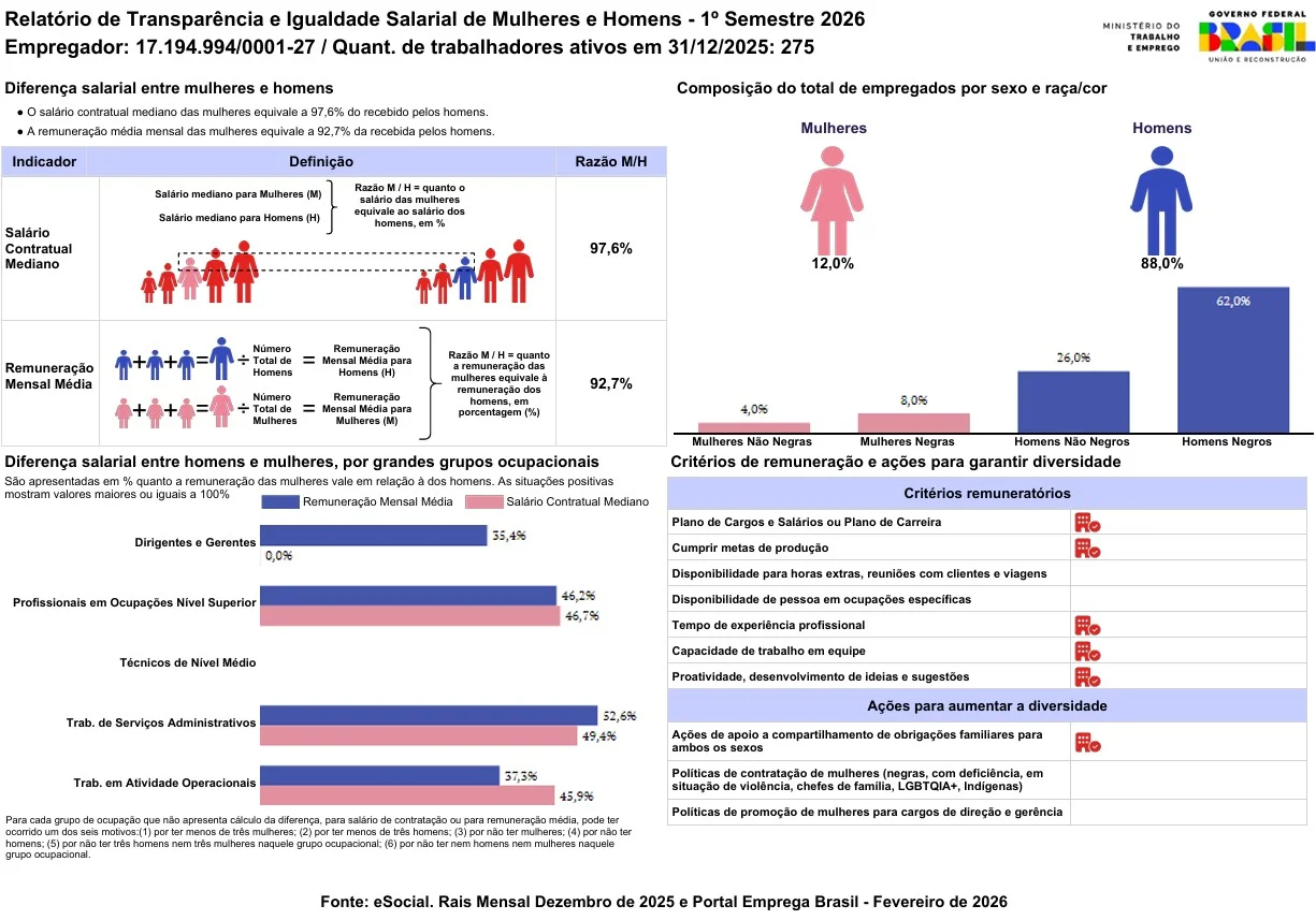 Por outro lado, a empresa assegura que homens e mulheres possuem os mesmos direitos e obrigações, sendo suas responsabilidades definidas em conformidade com a função desempenhada por cada um, JAMAIS, em razão da diferença de gênero, idade, cor, situação familiar, orientação sexual, entre outras, sendo garantido que todas as remunerações e oportunidades de crescimento profissional são observadas, independentemente do gênero.
